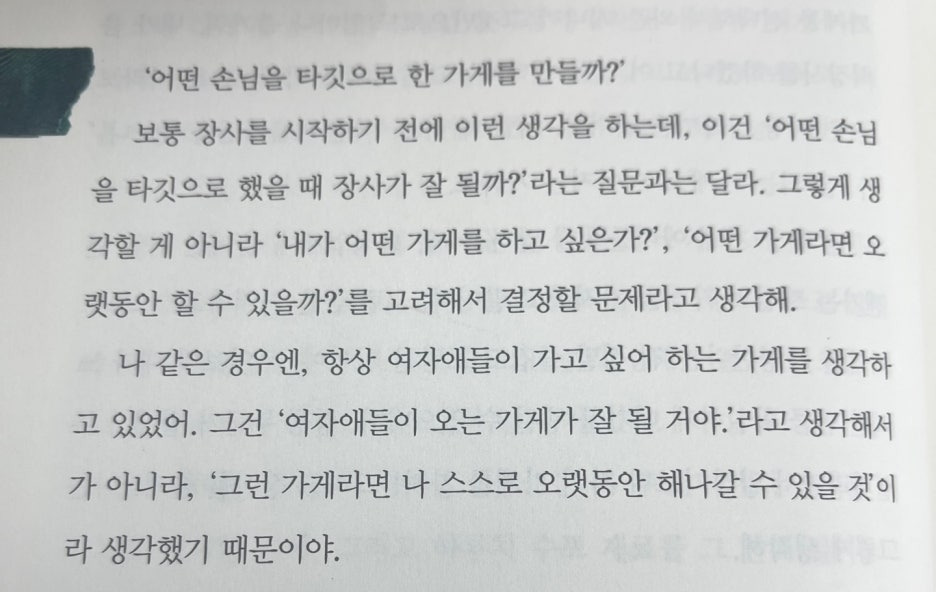 - '어떤 손님을 타깃으로 했을때 장사가 잘될까?' -> '내가 어떤 가게를 하고 싶은가?' '어떤 가게라면 오래동안 할 수 있을까?'
