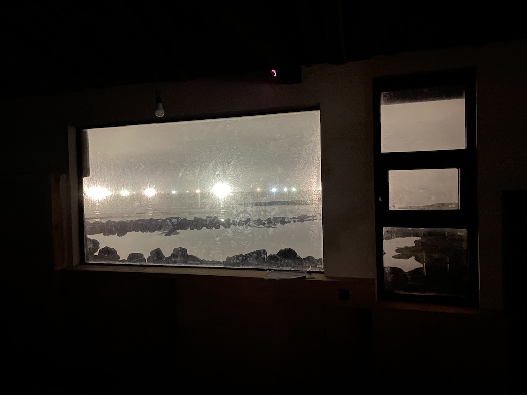 밤이 되니 오징어 잡이 배 불빛이 가로등 수준으로 비춘다.